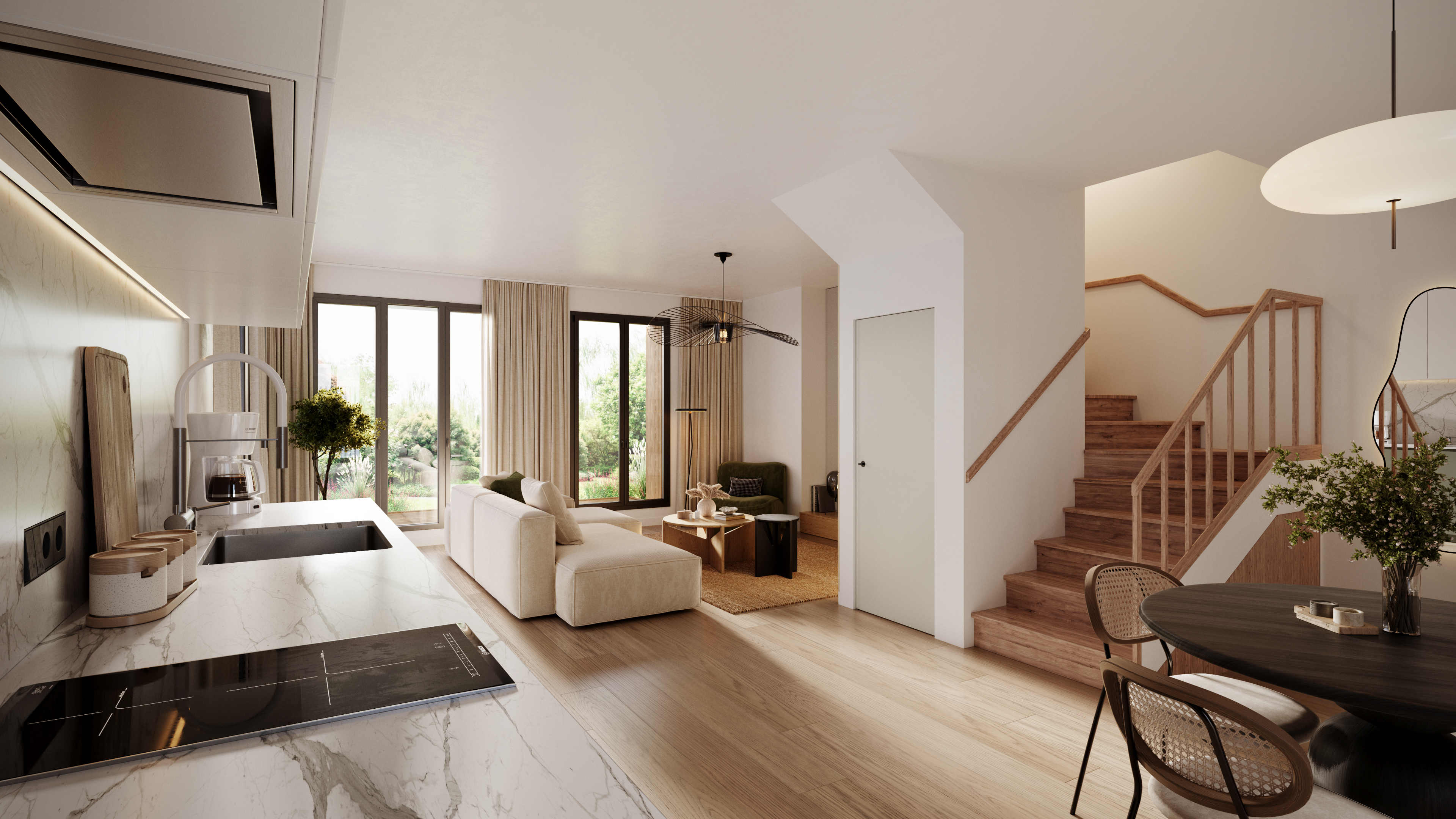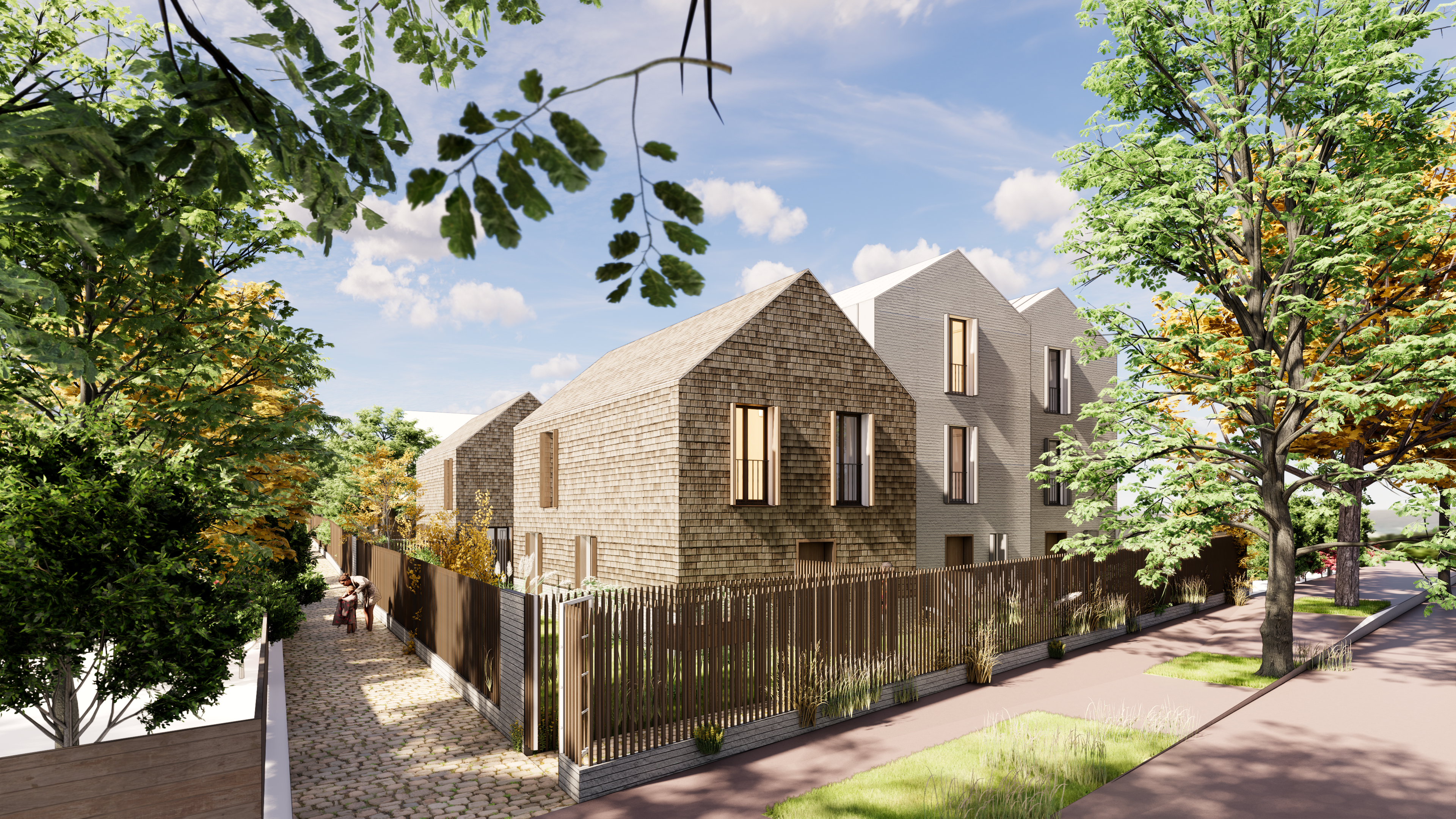 Imaginé par Atelier Lancelin Architectes, le projet associe matériaux naturels et architecture contemporaine, avec une conception bioclimatique répondant aux normes énergétiques RE2020. Chaque maison dispose de larges ouvertures sur l’extérieur, de prestations soignées et de performances énergétiques assurant confort durable et maîtrise des consommations.